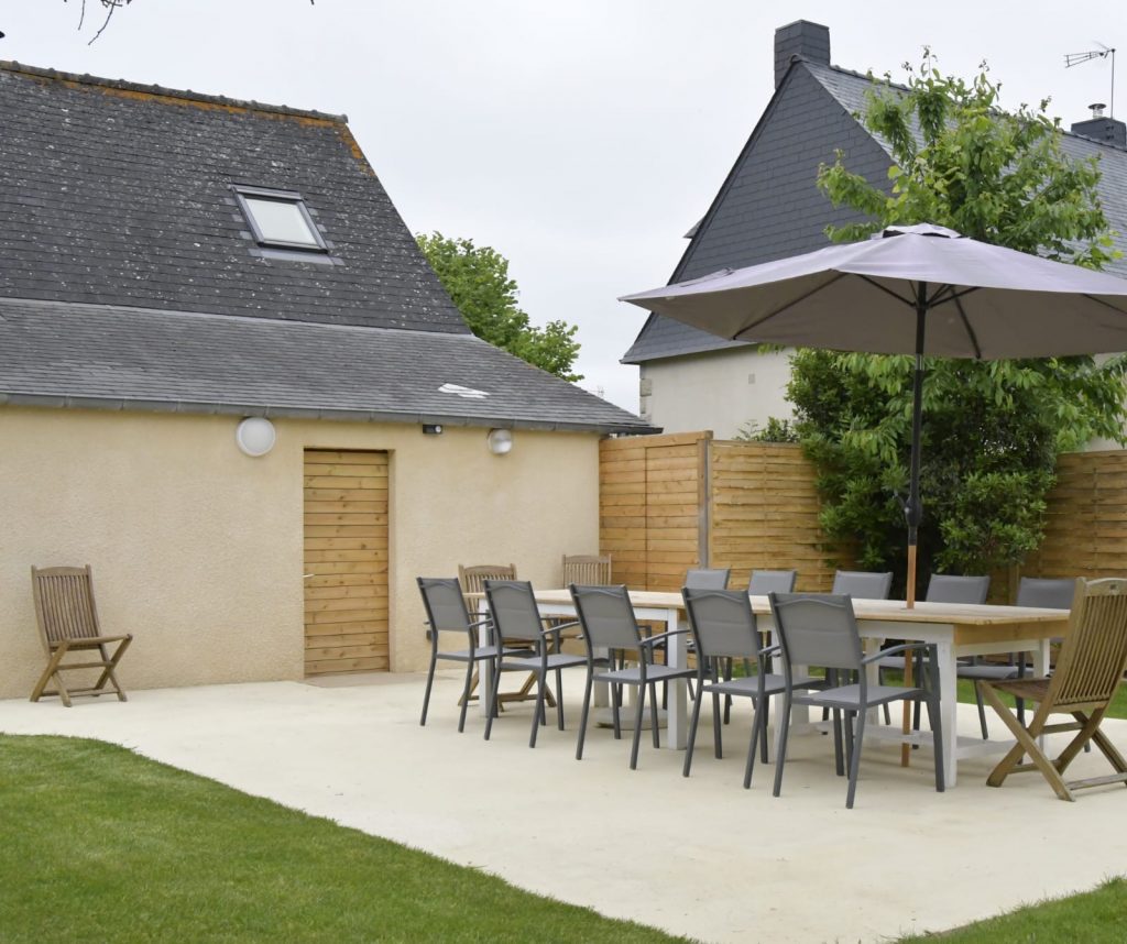 Le jardin est aménagé de 2 terrasses de 50m2 chacune, l’une est équipée d’un salon de jardin, l’autre d’une grande table et d’un espace barbecue.
